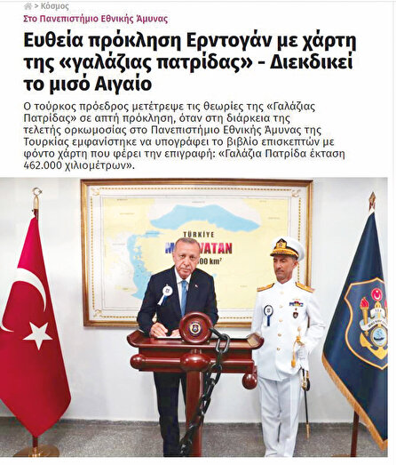 - Türkiye’nin deniz sınırlarını gösteren Mavi Vatan haritası Yunanistan’da ciddi infial uyandırdı. Geçtiğimiz hafta Milli Savunma Üniversitesi Harp Okulları Mezuniyet ve Sancak Devir Teslim Töreni’ne katılan Cumhurbaşkanı Erdoğan’ın arkasında görülen 462 bin kilometrekarelik harita, Yunanlıların en çok konuştuğu konu haline geldi.