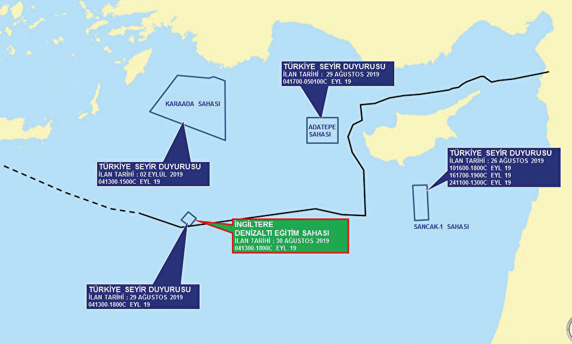 - Türk Deniz Kuvvetleri, Akdeniz’e ilişkin seyir duyurularını (Navtex) rutin olarak yapıyor. Yunanistan’la restleşmenin yaşandığı noktaya ek olarak donanma, Kıbrıs batısındaki Adatepe ve Karaada sahalarında da eğitimler yaptı. 10, 16 ve 24 Eylül tarihlerinde ise savaş gemileri, Kıbrıs güneyindeki Sancak sahasında boy gösterecek.