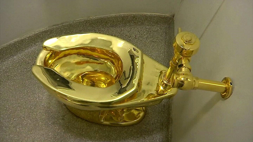 İtalyan sanatçı Maurizio Cattelan hiciv ağırlıklı heykel ve enstelasyon çalışmalarıyla tanınıyor. Sanatçının 18 karat altından yaptığı klozet biçimli heykel, eylül ayında İngiltere'de sergilendiği Bleinheim Sarayı'ndan çalınmıştı. "Amerika" adı verilen esere yaklaşık 6 milyon dolar değer biçiliyordu.