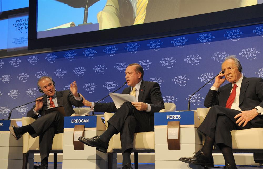 - Aralık'ta başlayan saldırıların ardından sadece birkaç hafta geçmişken, Şubat 2009'da İsviçre'de düzenlenen Dünya Ekonomik Forumu'nda, dönemin Başbakanı Recep Tayyip Erdoğan, İsrail Cumhurbaşkanı Şimon Peres'e dünyada yankı uyandıran bir çıkış yaptı. Erdoğan, Davos'ta Dünya Ekonomik Forumu kapsamında gerçekleştirilen “Gazze Orta Doğu'da Barış Modeli" oturumunda, İsrail Cumhurbaşkanı Şimon Peres'in eleştirilerini yanıtlarken panel yöneticisinin sürenin bittiğini gerekçe göstererek konuşmasını kesmesi üzerine bundan sonra Davos toplantılarına katılmayacağını açıklayarak salondan ayrılmıştı. Erdoğan, "Beni 12 dakika konuşturuyorsunuz, Peres 25 dakika konuştu. Benim için Davos bitmiştir" dedi. Erdoğan, Peres'e, "Sayın Peres, benden yaşlısın. Sesin çok yüksek çıkıyor. Biliyorum ki sesinin çok yüksek çıkması, bir suçluluk psikolojisinin gereğidir. Benim sesim bu kadar yüksek çıkmayacak. Bunu da böyle bilesin. Öldürmeye gelince siz öldürmeyi çok iyi bilirsiniz. Plajlardaki çocukları, nasıl öldürdüğünüzü çok iyi biliyoruz. Ülkenizde başbakanlık yapmış 2 kişinin bana çok önemli lafları vardır. "Tankların üstünde Filistin'e girdiğim zaman, 'kendimi bir başka mutlu addediyorum' diyen başbakanlarınız var. Tankların üzerine çıkıp da 'Filistin'e girince mutlu oluyorum' diyen başbakanlarınız var. peres'in konuşmasının salonda alkışlanmasıyla ilgili olarak da Erdoğan "Şu zulme alkış tutanları da ayrıca kınıyorum. Peki çocukları öldürenleri kalkıp da alkışlamak öyle zannediyorum ki insanlık suçudur" dedi. Başbakan Erdoğan'ın, “Sadece size, iki söz söyleyeceğim..." sözleri üzerine, oturum yöneticisi, araya girdi. Erdoğan, “sözümü kesmeyin" diyerek, “Tevrat'ın 6. maddesi der ki'öldürmeyeceksin. Burada öldürme var. Bu da çok enteresan" diyerek sözlerine devam etti.