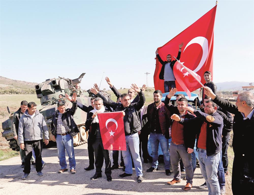 Operasyon bölgesine tank ve zırhlı araç sevkiyatı sürüyor. Farklı birliklerden gönderilen zırhlı personel taşıyıcı (ZPT), zırhlı muharebe aracı (ZMA) ve tanklardan oluşan konvoy dün Kilis’e ulaştı. Buradan da görev noktalarına intikal eden araçları sınırda bir grup vatandaş alkışlarla uğurladı. Gülbaba köyünde toplanan vatandaşlar, ellerindeki Türk bayraklarıyla “En büyük asker, bizim asker”, “Vur vur inlesin Afrin dinlesin” ve “Her Türk asker doğar” sloganları attı. Bazı vatandaşlar ise Mehmetçiğe sarıldı.