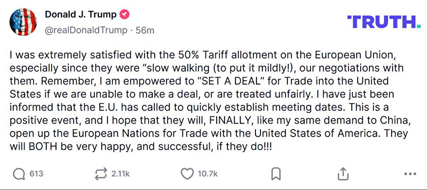 Trump da bu durumu başarı olarak nitelendiriyor ve ülkesinin kazanç sağladığını savunuyor. Trump son sosyal medya paylaşımında AB'nin toplantı istediğini açıkladı.