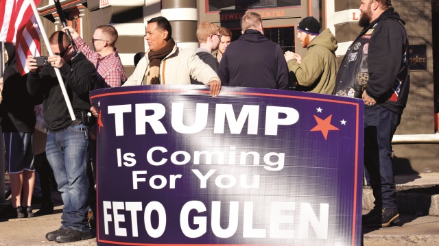 Donald Trump’ın ABD Başkanı seçilmesinin ardından Pensilvanya’da düzenlenen gösterilerde FETÖ elebaşı Gülen aleyhine pankart açıldı. Pankartta “Trump senin için geliyor FETO Gülen” ifadeleri yer aldı. Gülen’in bölgede yaşamasından rahatısız olduklarını belirten Trump taraftarları, elebaşının iade edilmesi çağrısında bulundu.