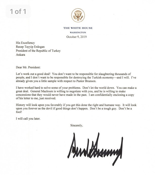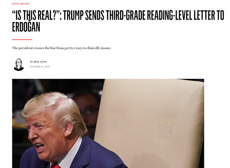 ABD Başkanı Donald Trump'ın, Cumhurbaşkanı Recep Tayyip Erdoğan'a yazdığı iddia edilen 9 Ekim tarihli mektubunda kullandığı dil ABD medyasında alay konusu oldu. Tuhaf ifadelerin yer aldığı ciddiyetsiz mektubun gerçekliği epey sorgulandı ancak Beyaz Saray'a yakın çoğu gazeteci mektubun varlığını doğruladı.