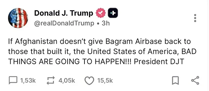 Paylaşımında Afganistan'a uyarıda bulunan Trump, "Eğer Afganistan, Bagram Hava Üssü'nü inşa eden ABD'ye geri vermezse, kötü şeyler olacak" dedi.