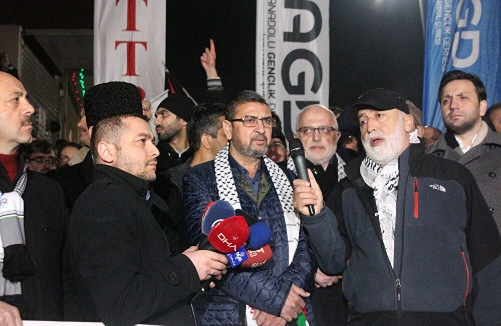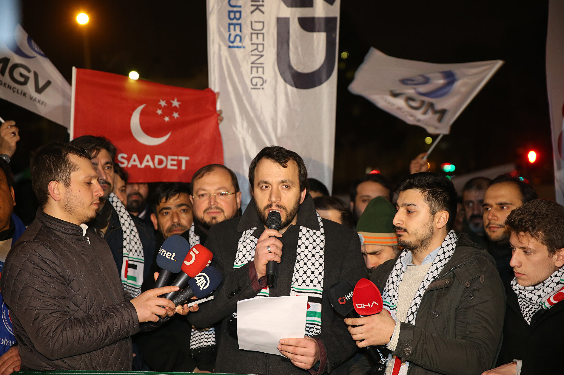 Protesto gösterisine kadın çocuk katılarak ABD’de ki açıklamalara tepki gösterilen protesto gösterisinde konuşan Anadolu Gençlik Derneği Milli Gençlik Vakfı Genel Başkanı Salih Turhan, “ABD Başkanı bu açıklamasını 3 yıl önce de gerçekleştirmişti. 3 yıl önceki ifadesinde dedi ki, ‘Biz İsrail’in başkenti olarak Tel Aviv’i ilan ediyor. Amerikan Başkonsolosluğu’nu Kudüs’e taşıyoruz’ gibi sahte bir açıklamayı ortaya koydu. Birincisi biz İsrail diye bir devleti tanımıyoruz. Biz Tel-Aviv’i başkent olarak da kabul etmiyoruz. Bizim için Filistin toprakları Müslümanlarındır. Eğer Amerika İsrail’i çok seviyorsa gitsin ona Kuzey Amerika’dan toprak versin. Orası Filistinlilerin toprakları” ifadelerini kullandı.