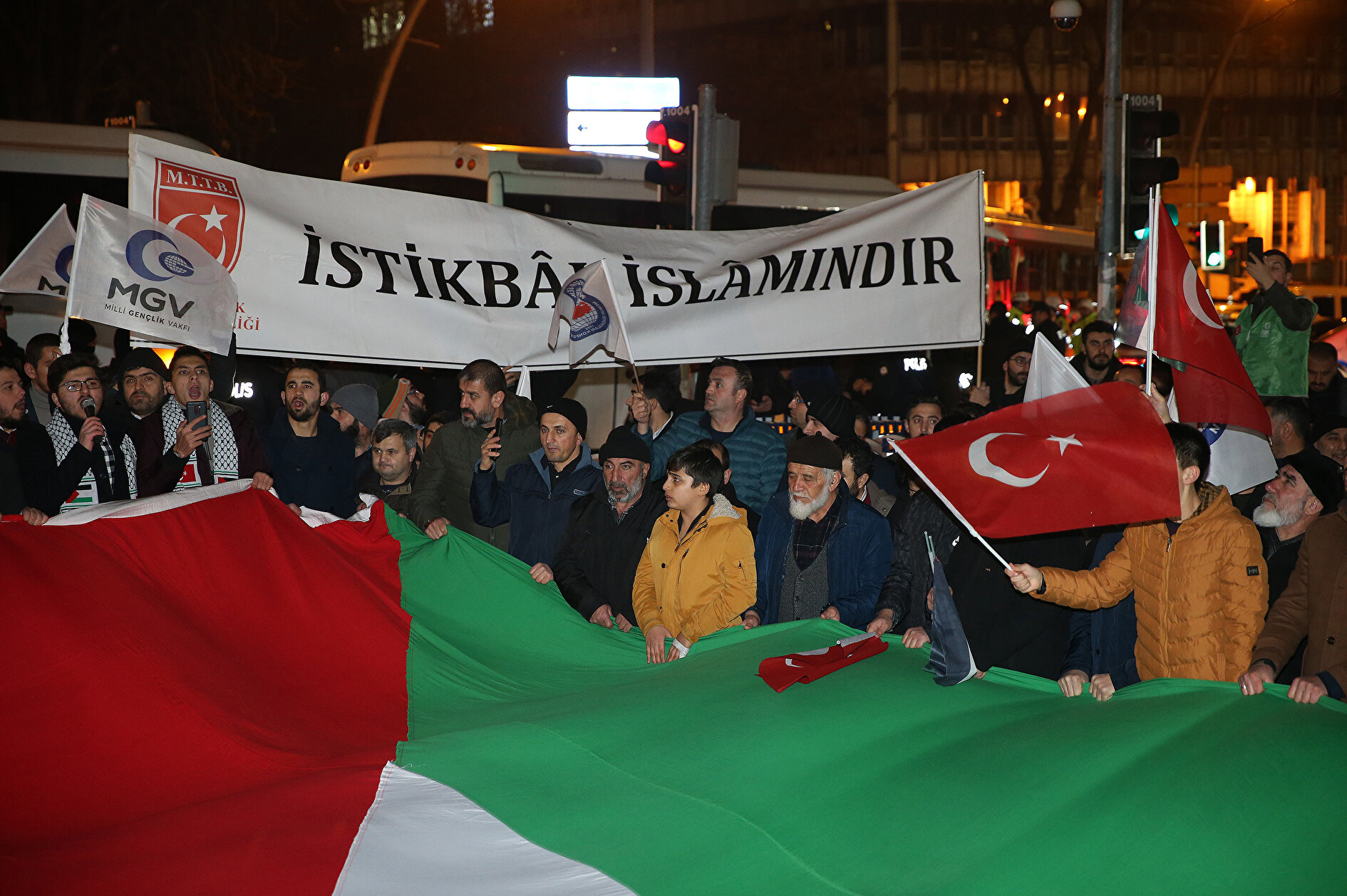 - Daha sonra söz alan İHH Ankara Başkanı Mustafa Sinan ise “Biz buraya kimseyi kınamaya gelmedik. Çünkü biz Siyonist bir devleti tanımıyoruz. Bu yaptıklarının yanlarında kalacaklarını zannediyorlar. Ama dünya yaratıldığından beri sürekli Hak ile Batıl savaş yapmıştır. Hak galip gelecektir. Hiç kimse boşuna sevinmesin, kibirlenmesin. Çünkü inşallah bizler dimdik ayaktayız. Bizler STK’lar olarak her zaman barıştan, adaletten ve insan haklarından yanayız” dedi.