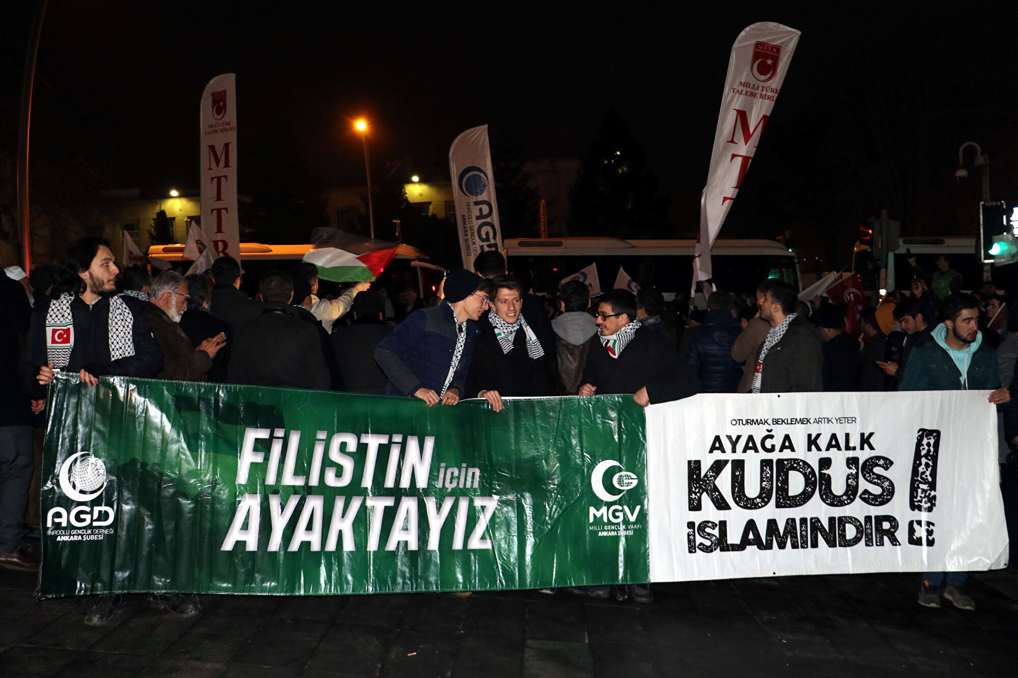 Ankara’da ABD Büyükelçiliği önünde toplanan Memur-Sen, İHH, MTTB, AGD-MGV üyeleri ile çok sayıda vatandaş, ABD’de alınan tek taraflı kararlara tepki gösterdi.