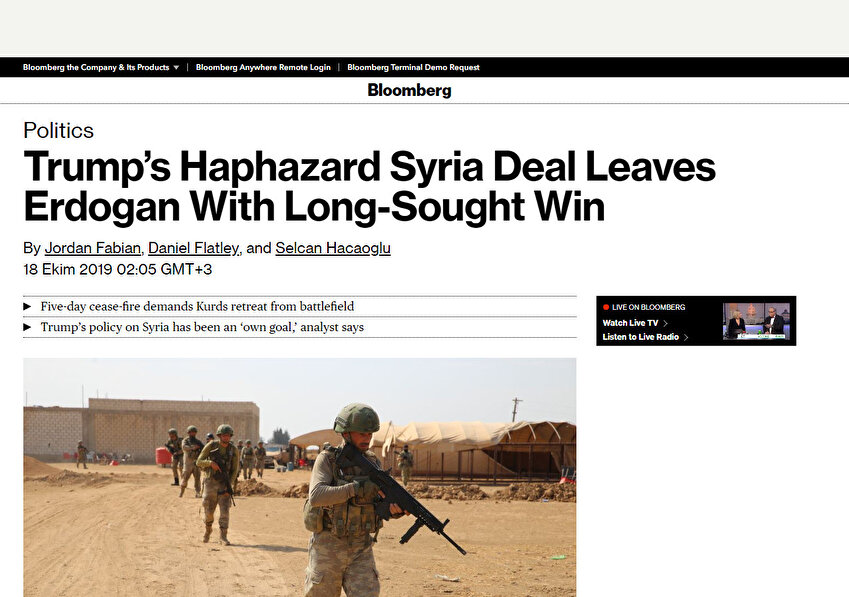 ABD'li Bloomberg dergisinde ise haber "Trump'ın plansız Suriye anlaşmaı Erdoğan'a uzun soluklu zafer kazandırdı" başlığıyla verildi.