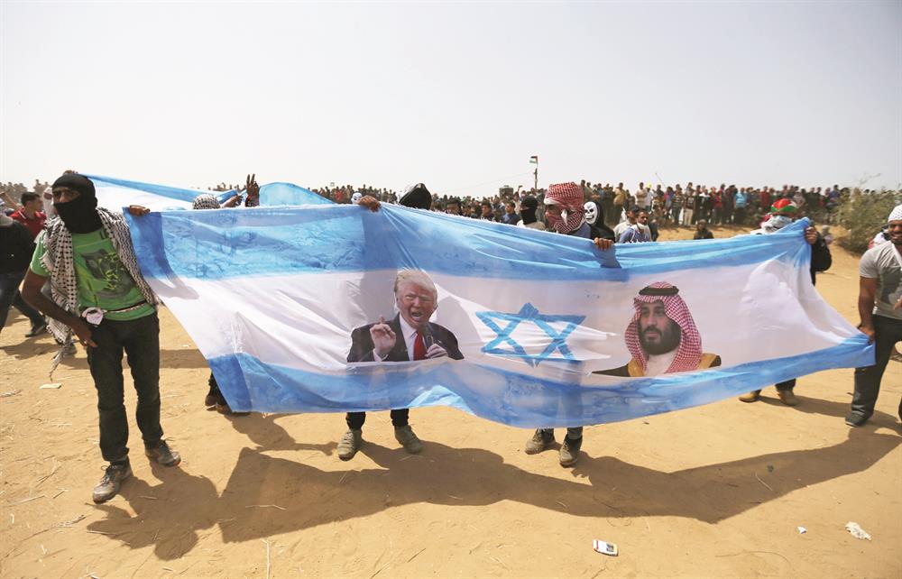 Filistinliler, “Büyük Dönüş Yürüyüşü”nün üçüncü cumasını “Bayrak Yakma” günü ilan etti. Gazze sınırında İsrail bayrakları yakılırken, ABD Başkanı Trump ve Suudi Veliaht Prensi Muhammed bin Selman’ın fotoğraflarının İsrail bayrağı üzerine koyulması dikkat çekti.