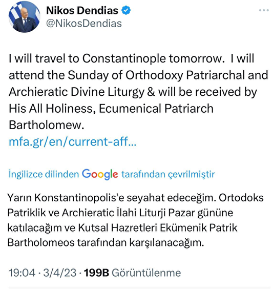 Ortodoks Patriklik ve Archieratic Pazar gününe katılmak için İstanbu'la gelecek olan Yunanistan Dışişleri Bakanı Nikos Dendias, attığı tweetde tarihi yok sayarak küstahça "Konstantinapolis" ifadesini kullandı. Bu durum twitter'da büyük tepki topladı.