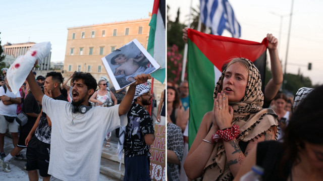Yunanistan'ın başkenti Atina'da düzenlenen Filistin'e destek gösterisinde, ellerinde tencere ve kaşık taşıyan eylemciler, İsrail'in ablukası altındaki Gazze'de oluşan açlıktan ölen sivillere dikkati çekti.