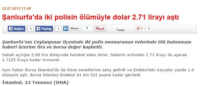 DHA'nın abonelerine "Şanlıurfa'da iki polisin ölümüyle dolar 2.71 lirayı aştı" başlığı ile geçtiği haber şöyle: