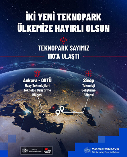 Sanayi ve Teknoloji Bakanı Mehmet Fatih Kacır, Cumhurbaşkanı Recep Tayyip Erdoğan'ın imzasıyla Resmi Gazete'de kuruluş kararı yayımlanan ODTÜ Uzay Teknolojileri Teknoloji Geliştirme Bölgesi ve Sinop Teknoloji Geliştirme Bölgesi ile Türkiye'deki teknopark sayısının 110'a ulaştığını açıkladı.