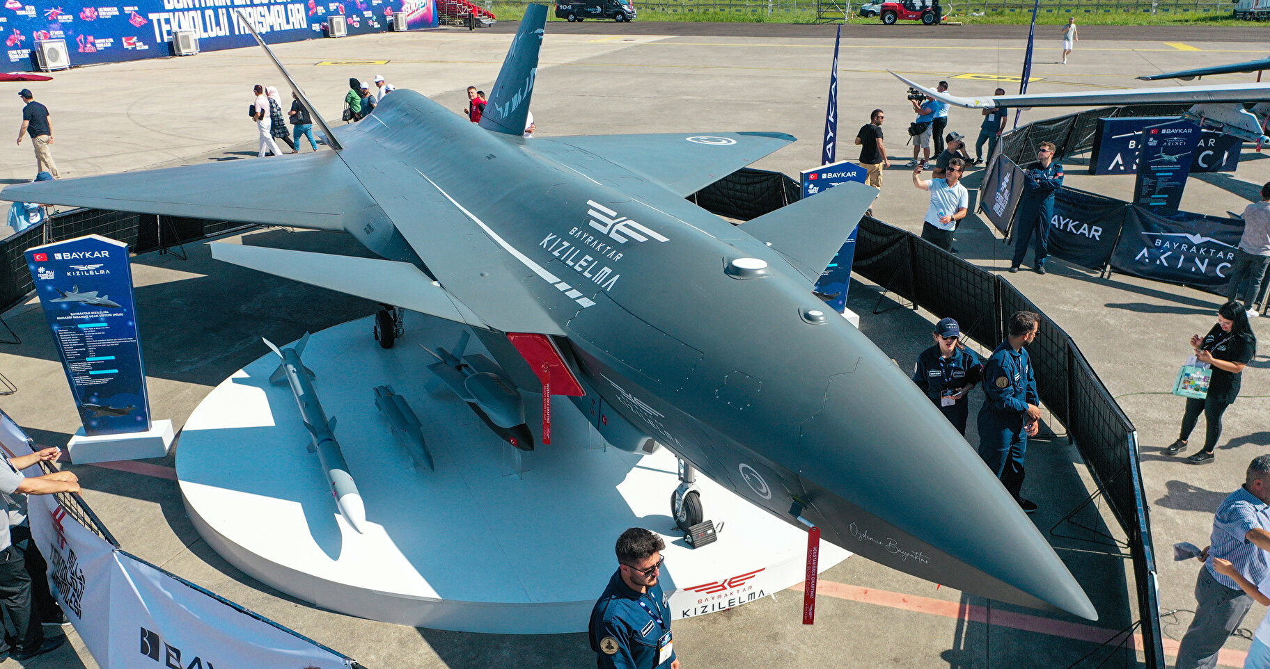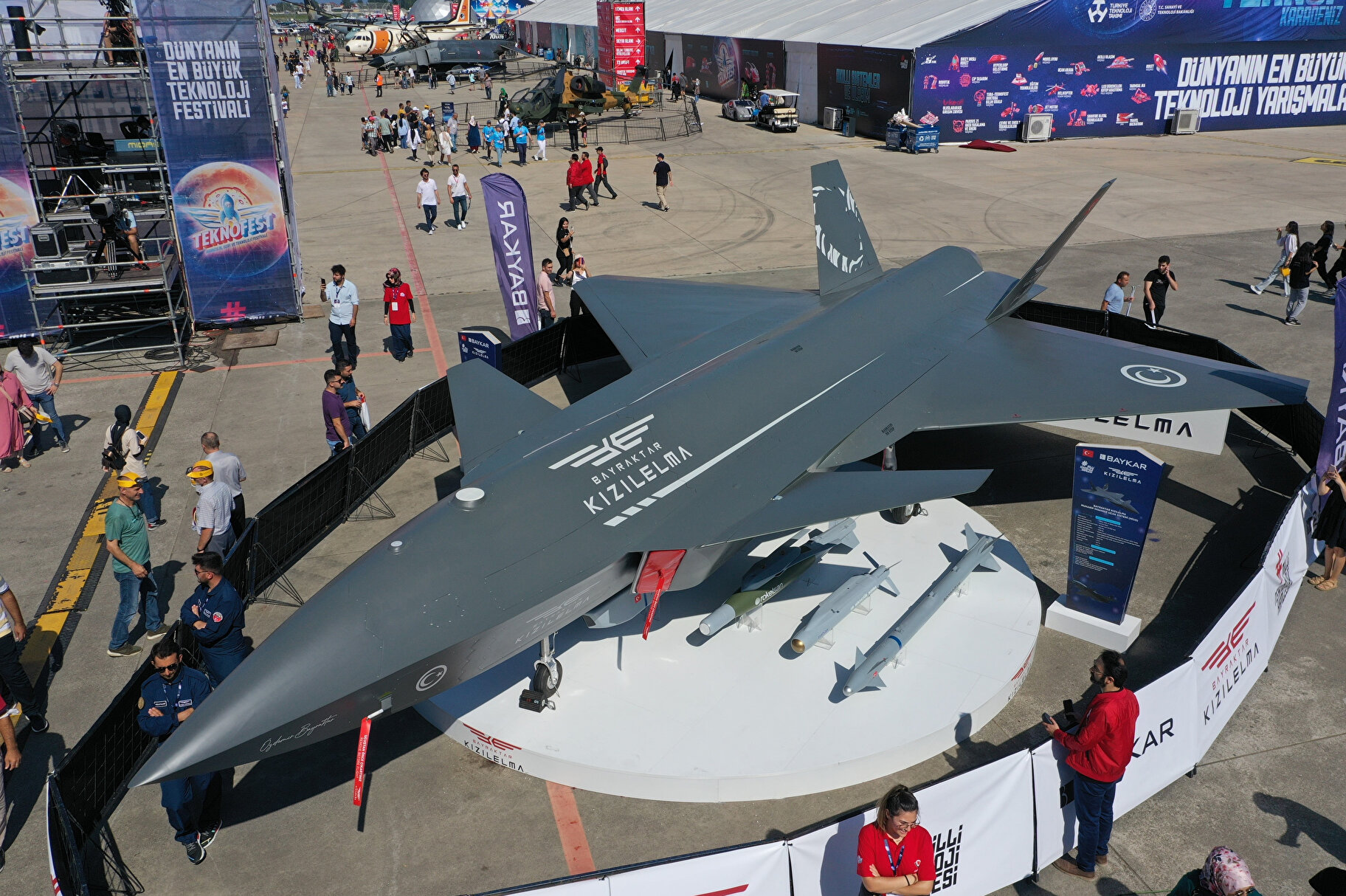 Festivalde Baykar Teknoloji tarafından tasarım ve geliştirme çalışmaları tamamlanan insansız savaş uçağı “Bayraktar KIZILELMA” ilk kez sergilendi.
