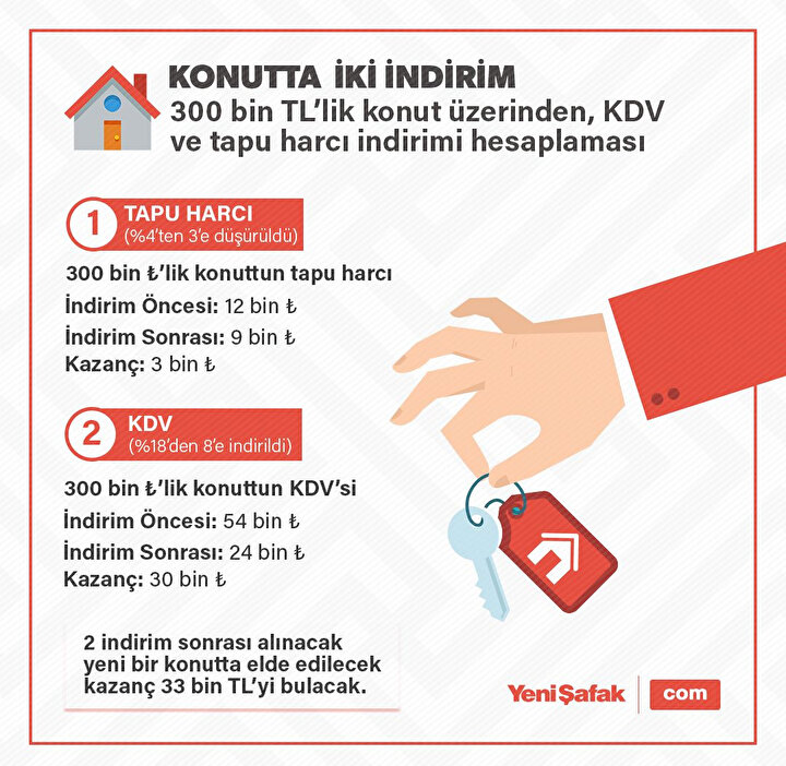 Sadece KDV indirimi değil tapu harcı tarafında da yüzde 4'lük kısım yüzde 3’e indirilmişti. Bu uygulamada da takvim yıl sonu olarak belirlenmiş durumda. Mayıs ayından beri uygulanan yüzde 10'luk indirim ile 300 bin TL'lik bir konutta KDV'den 30 bin TL, tapu harcı tarafın 3 bin lira cepte kalıyor.