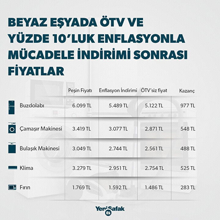 Beyaz eşyada yüzde 6.7’lik ÖTV oranını sıfırlanmasıyla ortalama bir beyaz eşya 300 TL indirimli alınabilirken, indirim oranları eşyasına göre bin TL’ye kadar çıkıyor. Mobilya tarafında 1.5 ayda satışları yüzde 30 artıran yüzde 8'lik KDV uygulaması ile uygun fiyatla her türlü mobilyada seçenekler sunuluyor.
