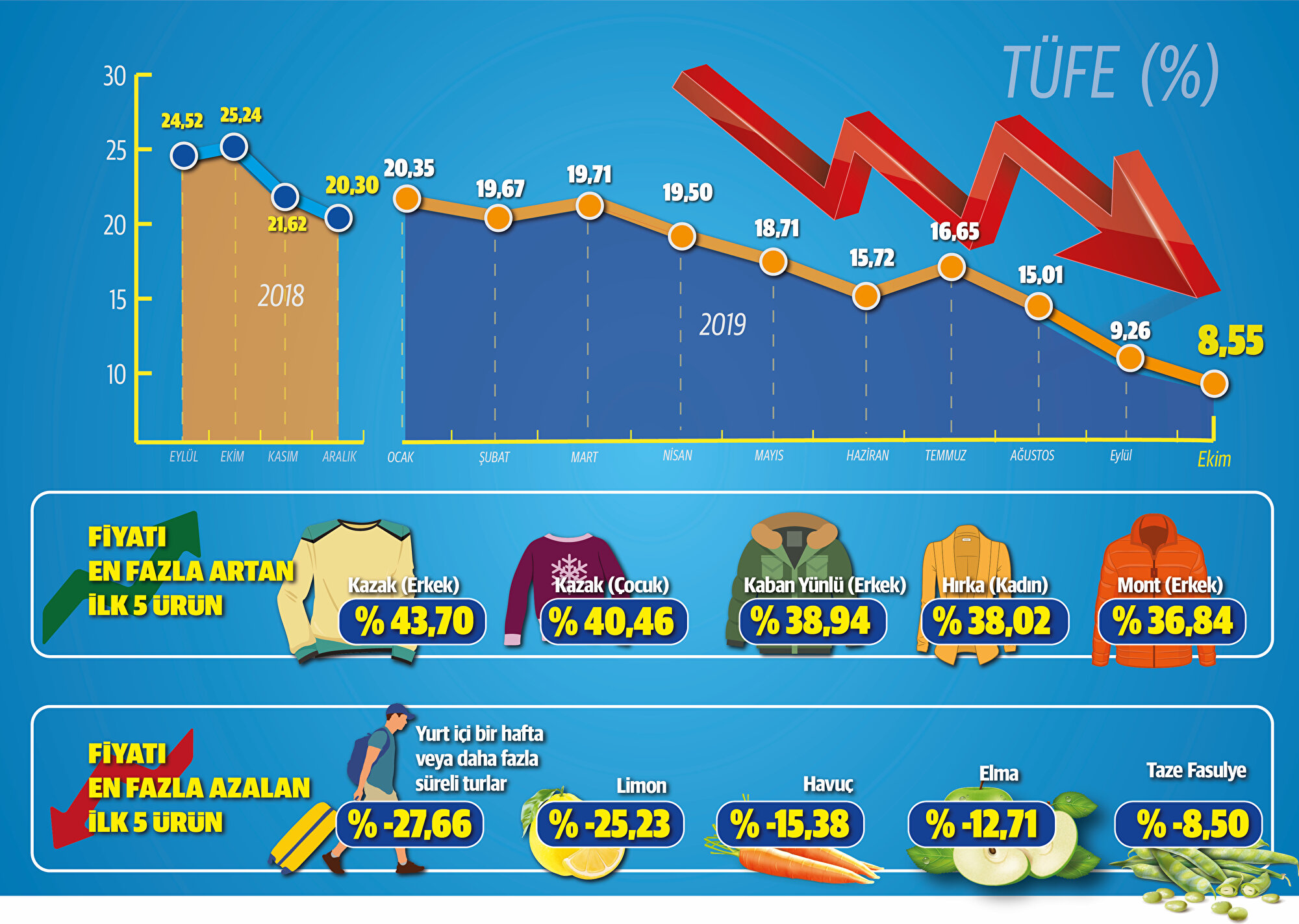 Böylece TÜFE'de Aralık 2016'daki 8,53'lük artıştan sonra yıllık enflasyonda en düşük artış oranı gerçekleşti. Yaklaşık üç yıllık aradan sonra kaydedilen yüzde 8,55, tüketici enflasyonunda bu yıl görülebilecek en düşük rakam olarak kayıtlara geçti. Tüketici enflasyonunun son yıllardaki en yüksek oranı Ekim 2018’de yüzde 25,24 olarak görülmüştü. Tüketici fiyatlarının bir yıl içinde yüzde 25,24’ten yüzde 8,55’e kadar gerilemesinde, TL’nin kurlar karşısındaki direnişini sürdürmesi ve üretici maliyetlerinin yükselmemesi etkili oldu. Yİ-ÜFE ise Aralık 2018'e göre yüzde 6,71, geçen yılın ekim ayına göre de yüzde 1,7 arttı.