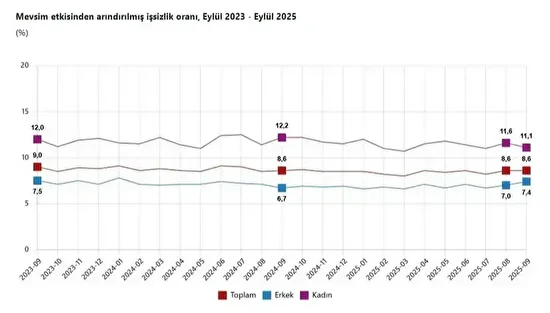 TÜİK, Eylül 2025 dönemine ilişkin iş gücü istatistiklerini açıkladı. Buna göre; 15 ve daha yukarı yaştaki kişilerde işsiz sayısı 2025 yılı Eylül ayında bir önceki aya göre 12 bin kişi artarak 3 milyon 75 bin kişi oldu. İşsizlik oranı değişim göstermeyerek yüzde 8,6 seviyesinde gerçekleşti. İşsizlik oranı erkeklerde yüzde 7,4 iken kadınlarda yüzde 11,1 olarak kaydedildi. İstihdam edilenlerin sayısı 2025 yılı Eylül ayında bir önceki aya göre 200 bin kişi azalarak 32 milyon 491 bin kişi, istihdam oranı ise 0,3 puan azalarak yüzde 48,9 oldu. Bu oran erkeklerde yüzde 66,3 iken kadınlarda yüzde 31,8 olarak gerçekleşti. İş gücü, 2025 yılı Eylül ayında bir önceki aya göre 188 bin kişi azalarak 35 milyon 566 bin kişi, iş gücüne katılma oranı 0,3 puan azalarak yüzde 53,5 olarak gerçekleşti. İş gücüne katılma oranı erkeklerde yüzde 71,6 iken kadınlarda yüzde 35,7 oldu.