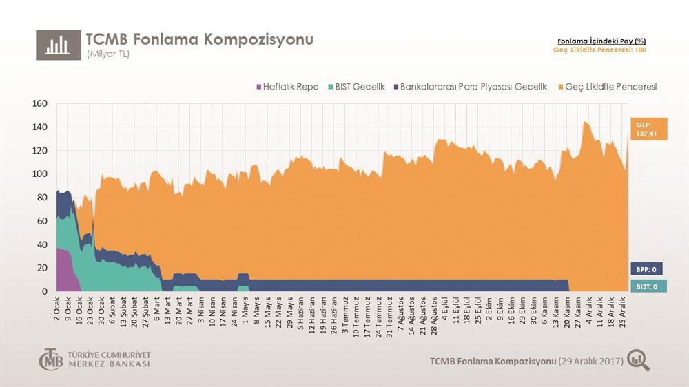 Merkez Bankası piyasayı fonlama kompozisyonu incelendiğinde 4,5 aydır bütün piyasayla olan işlemlerinin yüzde 100’ü geç likidite penceresinden yapılıyor. Bu durum; Merkez Bankası’nın piyasayı fonlama işlemlerinin tamamı (29 Aralık 2017 itibariyle haftalık 137,4 milyar lira) bu pencere üzerinden gerçekleşiyor. Ancak Merkez Bankası’nın uyguladığı yüzde 12,75’lik oran da piyasayı doyurmuyor. Gösterge faizi dün yüzde 14,39’a kadar çıktı.