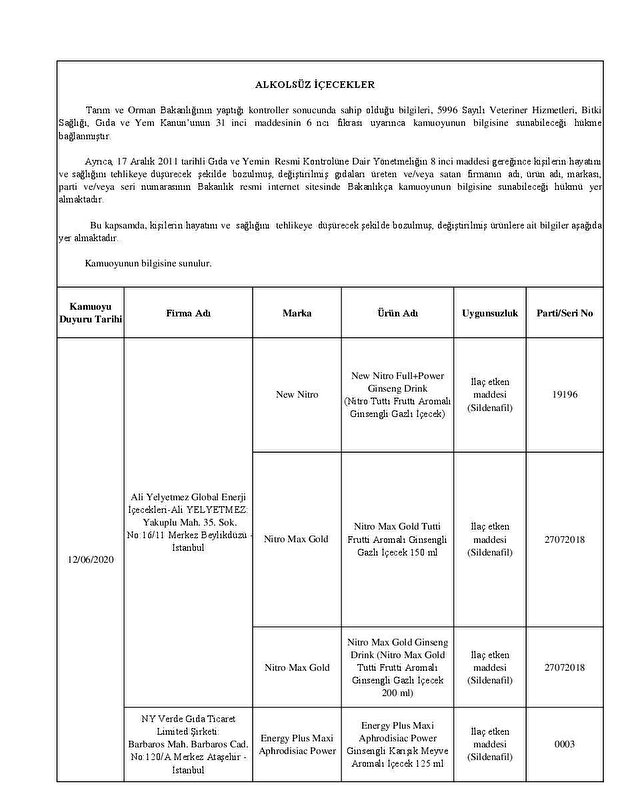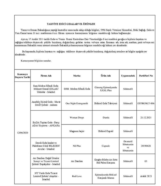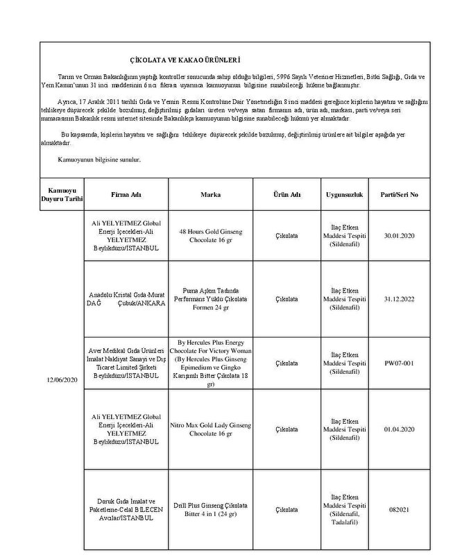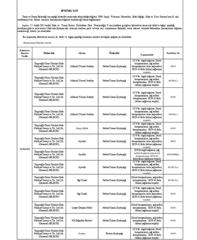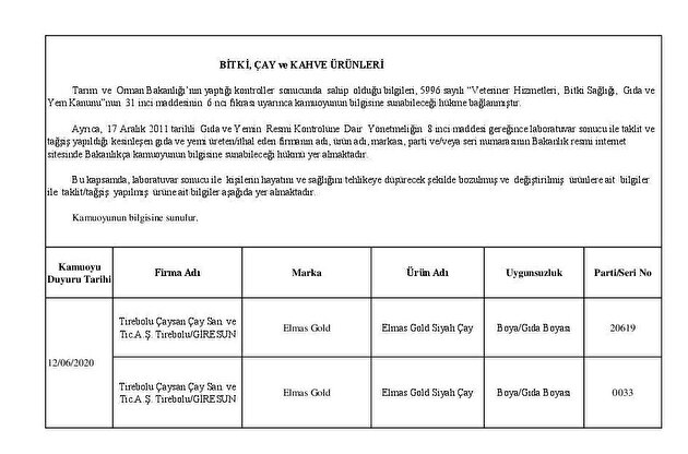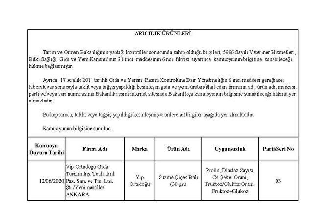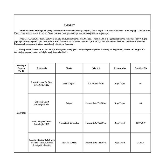 Tarım ve Orman Bakanlığı gıda teröristlerine fırsat tanımıyor. Bakanlık 69 firmaya ait 136 üründe sahtecilik belirledi, firmalar internet sitesinde ilan edildi. Bakanlıktan yapılan açıklamada, "Taklit, tağşiş yapıldığı veya ilaç etken maddesi ilave edildiği tespit edilen toplam 69 firmaya ait 136 parti ürün Bakanlığımız internet sitesinde kamuoyunun bilgisine sunulmuştur" ifadeleri kullanıldı.