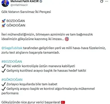 "TÜBİTAK SAGE tarafından geliştirilen yerli ve milli hava-hava füzelerimiz BOZDOĞAN ve GÖKDOĞAN, zorlu test atışlarını başarıyla tamamladı. BOZDOĞAN, itki vektör kontrolüyle üstün manevra kabiliyeti, gelişmiş kızılötesi arayıcı başlıkla hassas hedef takibine sahip. GÖKDOĞAN, zorlayıcı koşullarda bile tam isabet sağlıyor, gelişmiş arayıcı başlık ve kontrol algoritmalarıyla mükemmel performans sergiliyor. Gökyüzünde nice gurur verici başarılara."