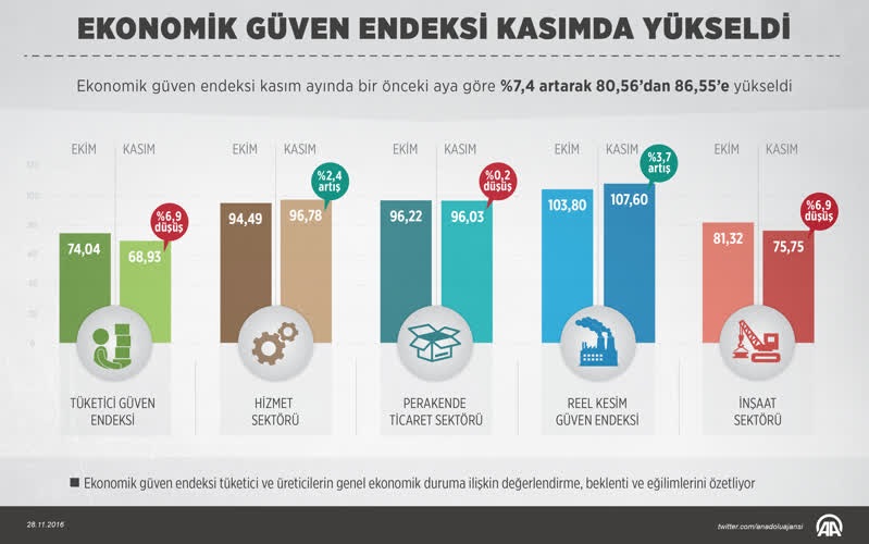 Buna göre, ekonomik güven endeksi Kasım ayında bir önceki aya göre yüzde 7,4 oranında artarak 80,56 değerinden 86,55 değerine yükseldi. Ekonomik güven endeksindeki artış, reel kesim (imalat sanayi) ve hizmet sektörü güven endekslerindeki artışlardan kaynaklandı.