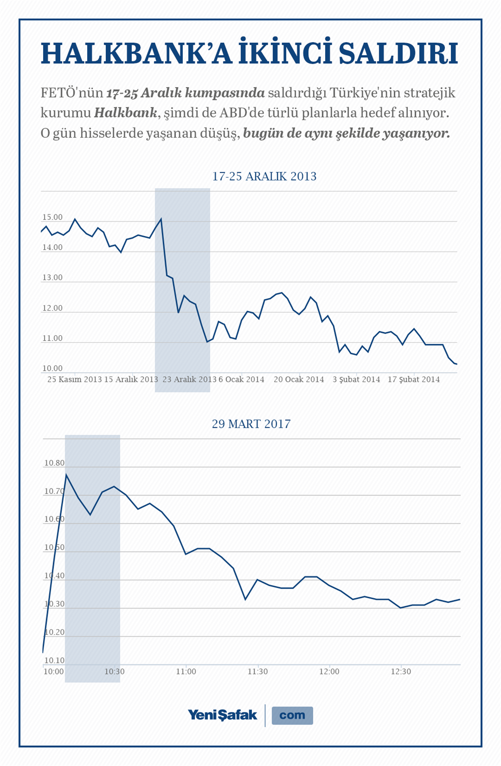 Türkiye'yi hedef alan 17-25 Aralık kumpasıyla devre dışında bırakılmak istenen en 'stratejik' kurumlardan biri de Halkbank'tı. FETÖ yapılanmasının hedefi olan Halkbank hisseleri yüzde 12,34 değer kaybetmişti. Ardından önce günlük yüzde 4 değer kaybeden Halkbank hisselerinde düşüş ikinci seansta da hızlandı. Halkbank hisseleri yüzde 12,34 kayıpla 13,80 liraya düştü. Dün yaşanan olay, 17-25 gibi Türk ekonomisine karşı yeniden bir planlama yapıldığını gözler önüne serdi.