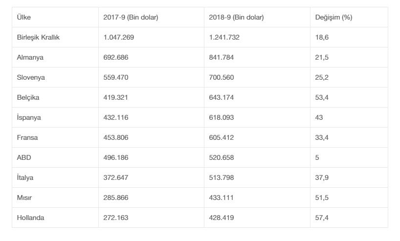 Kentten yapılan ihracatın 2017'nin ocak-eylül dönemine göre yüzde 25 arttığı Slovenya, 700 milyon 560 bin dolarla üçüncü sırada yer aldı. Bu ülkeleri, 643 milyon 174 bin dolarla Belçika, 618 milyon 93 bin dolarla İspanya takip etti.