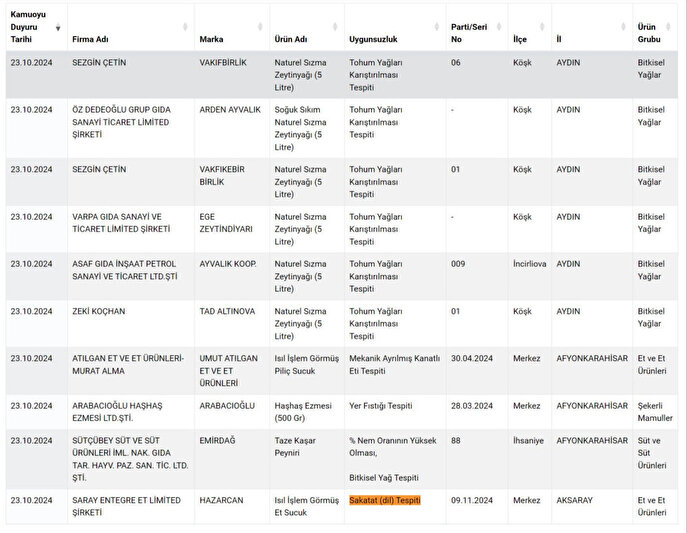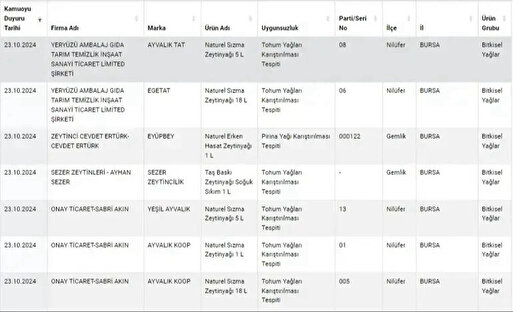 Tarım ve Orman Bakanlığı, gıda güvenliğini sağlamak amacıyla düzenli olarak yaptığı denetimlerde, taklit ve tağşiş ürünleri ifşa etmeye devam ediyor. Bakanlığın internet sitesinde yayımlanan son listede