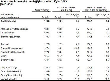 Türkiye İstatistik Kurumu eylül ayı sanayi üretim rakamlarını açıkladı. TÜİK tarafından açıklanan son verilere sanayi üretimi beklentilerin üzerine çıkarak bir önceki yılın aynı ayına göre yüzde 3,4 artış gösterdi. Eylül ayı verisi ile sanayi üretimi yıllık bazda Ağustos 2018'den beri ilk kez yükselirken, Temmuz 2018'den beri de en yüksek seviyeye çıkmış oldu.
