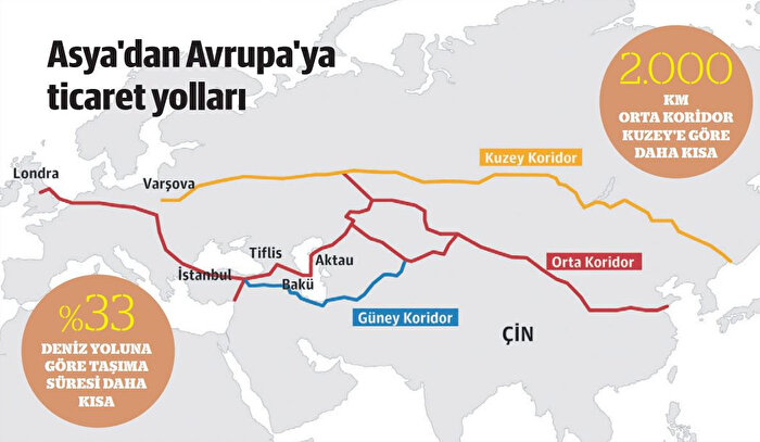 Orta Koridor Türkiye’den başlayarak, demiryolu ve karayolu bağlantılarıyla; sırasıyla Gürcistan, Azerbaycan ve Hazar Denizine, buradan da (Hazar geçişi kullanılarak) Türkmenistan-Özbekistan-Kırgızistan veya Kazakistan güzergâhını takip ederek ÇHC’ye uzanıyor. Bu çerçevede, Bakü/Alat (Azerbaycan), Aktau/Kuryk (Kazakistan) ve Türkmenbaşı (Türkmenistan) limanları Hazar geçişindeki kombine taşımacılık için kullanılıyor. Bir yıl içinde Çin’den Avrupa’ya giden 10 milyon konteynırın %96’sı denizyoluyla, ancak %4’ü Kuzey Koridoru olarak adlandırılan Trans-Sibirya Demiryolu hattı üzerinden sevk edildi.