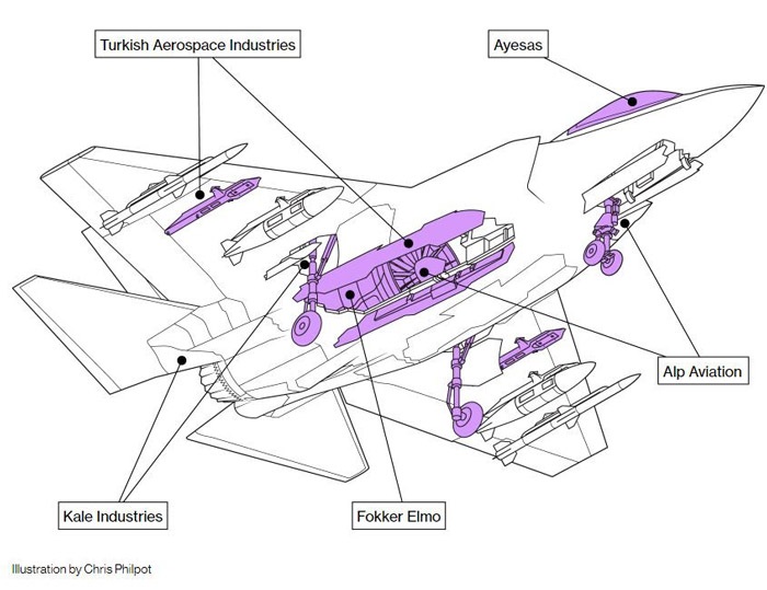 ABD merkezli Bloomberg Businessweek, Türkiye’nin F-35 projesindeki kritik rolünü tüm dünyaya gösterdi. ABD Kongresi, Türkiye’nin Rusya’dan S-400 savunma sistemini satın almasını gerekçe göstererek, Türkiye’ye F-35 yeni nesil savaş uçaklarının teslimatının geçici olarak durdurulmasını istiyor.