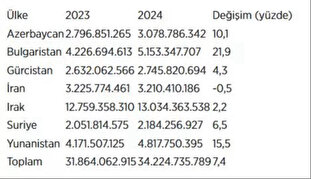 Türkiye'nin Azerbaycan, Bulgaristan, Gürcistan, İran, Irak, Suriye ve Yunanistan'a ihracatı, 2024'te yüzde 7,4 artışla 34,2 milyar dolara ulaşarak rekor kırdı.