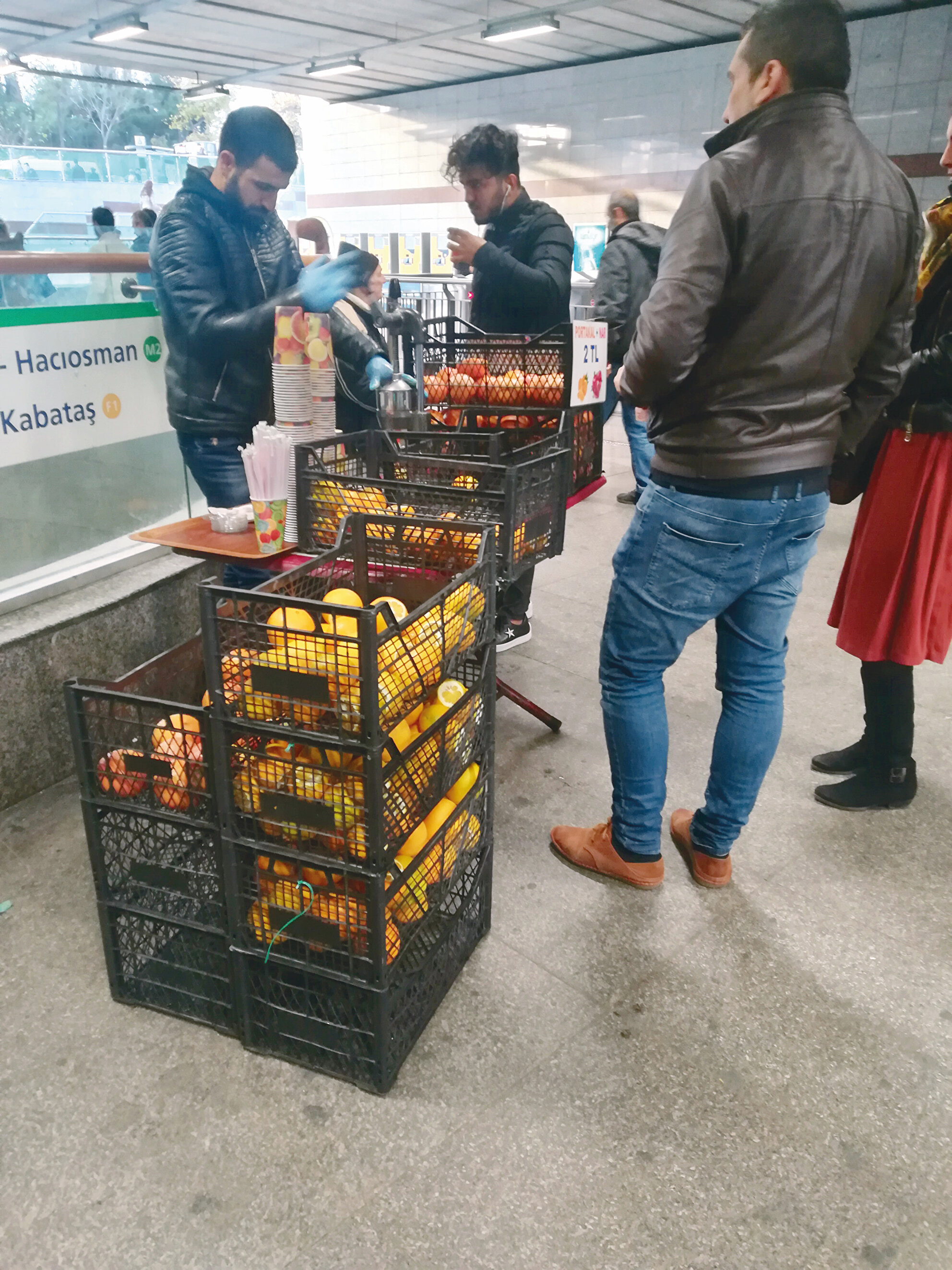 Mecidiyeköy otobüs duraklarında sabah 6’da yerini alan Halil Y., son 2 yıldır kış aylarında taze meyve suyu işine girmiş. Özellikle sabah saatlerini seçtiğini anlatan Halil Y., “Son senelerde vatandaş güne zinde başlamak istiyor, bu saatte hemen her yer kapalı olur haliyle bizim işler de artar” sözlerine ek olarak 7 Aralık Cuma günü itibariyle İstanbul Hali’nden aldığı meyvelerin geliş fiyatını aktarmayı ihmal etmiyor: “Elmanın kilosunu 1 liradan aldık. Golden 2, greyfurt 2, nar 2,5 portakal 1,5 lira ikinci kalite alırsan 50 kuruş.”
