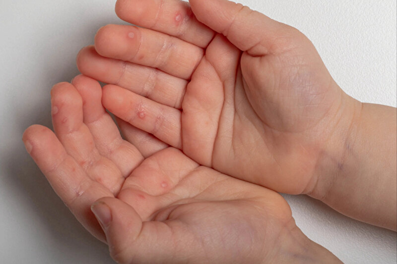 - Döküntüler:Özellikle el, ayak, popo ve bazen vücutta kırmızı kabarcıklar şeklinde görülür.