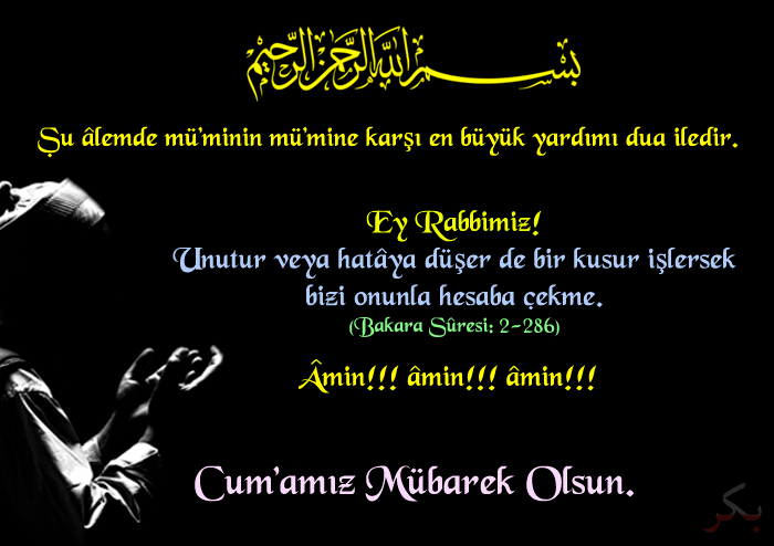 * Allah'ım! Bu mübarek Cuma günü hürmetine, bizi sevdiğin kullar arasına kat, bizi çok sabreden, çok şükreden kullarından eyle. Seni çok analım ömrümüz seviğin ve razı olacağın işlerle (amellerle) geçsin. Sıhhat ve afiyet daim eyle. Sevdiklerimizi bize bağışla. Amin! Hayırlı Cumalar.
