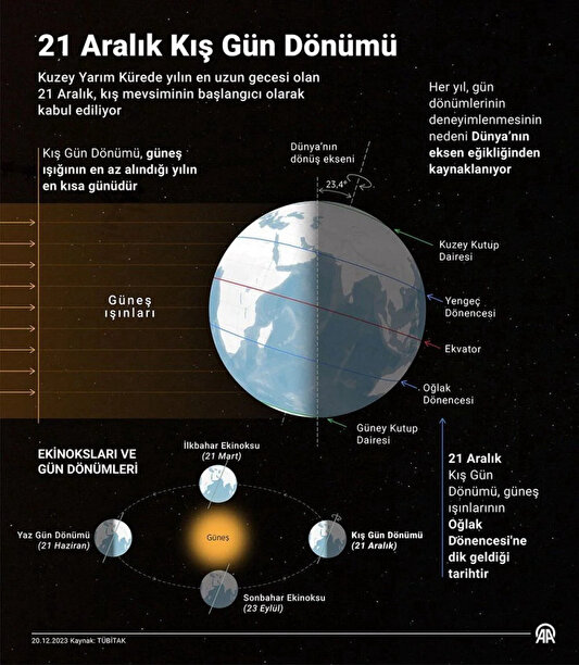 En uzun gece olarak kabul edilen kış gündönümü, Güney Yarımküre'de yaz, Kuzey Yarımküre'de kış mevsiminin başlangıcıdır. Bu tarihte Güneş ışınları Güney Yarımküre'ye gelebileceği en dik, Kuzey Yarımküre'ye en eğik açılarla gelir. En uzun gece ne zaman, bugün mü, 21 Aralık ne günü, günler uzayacak mı? En uzun gece ve gündüzün yaşanacağı tarih!
