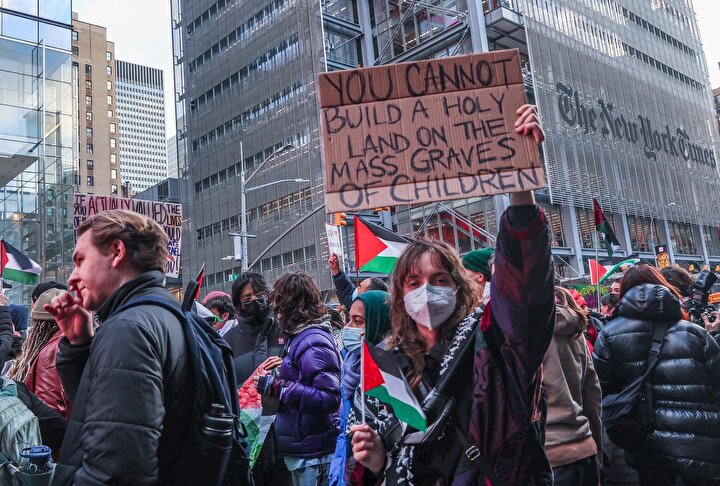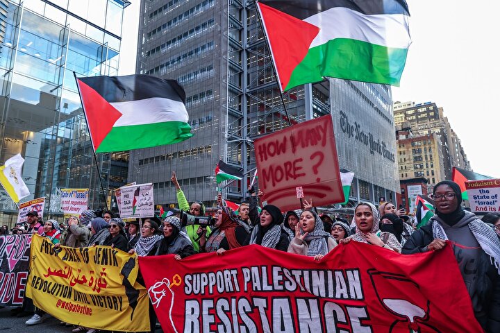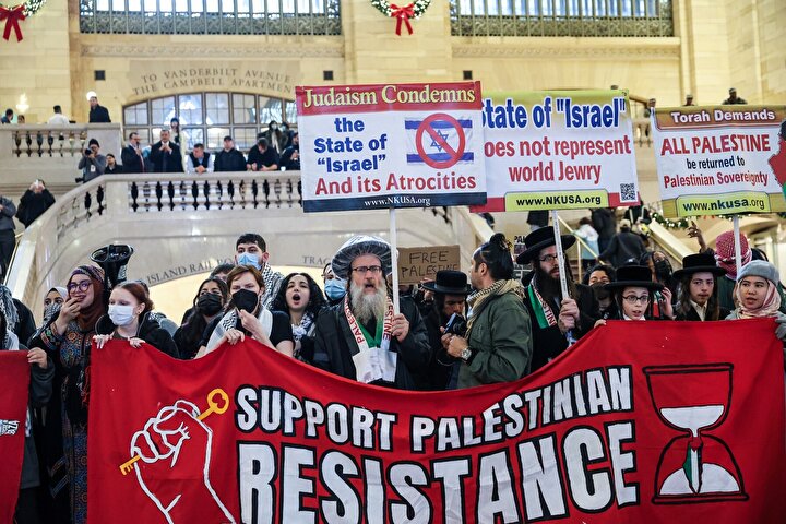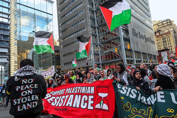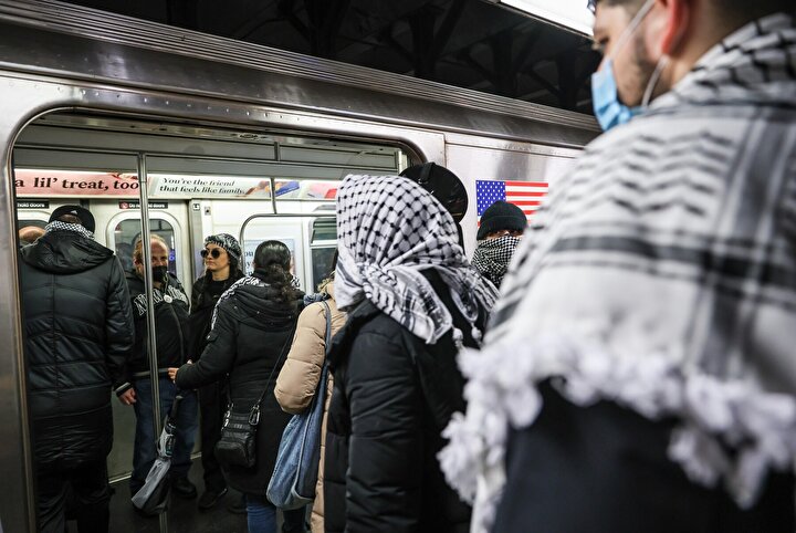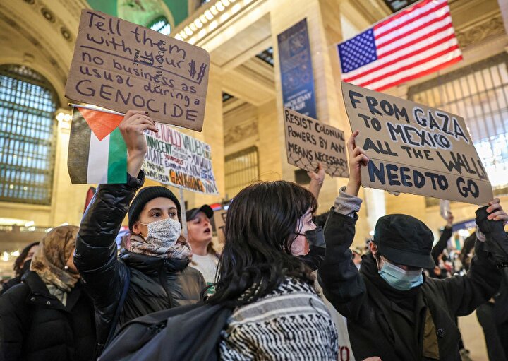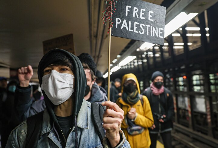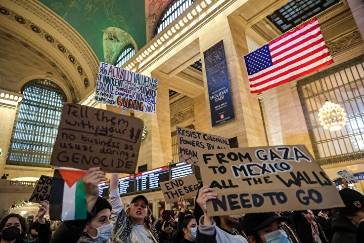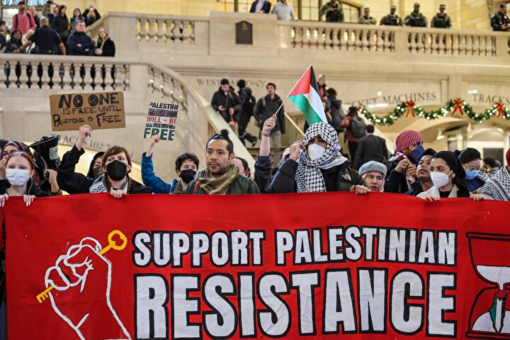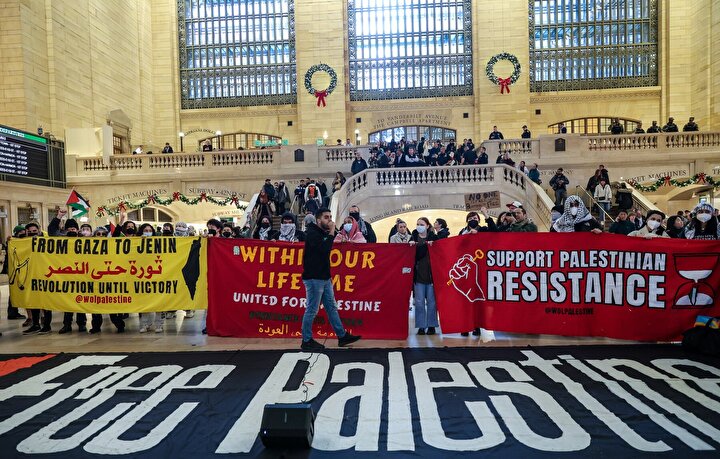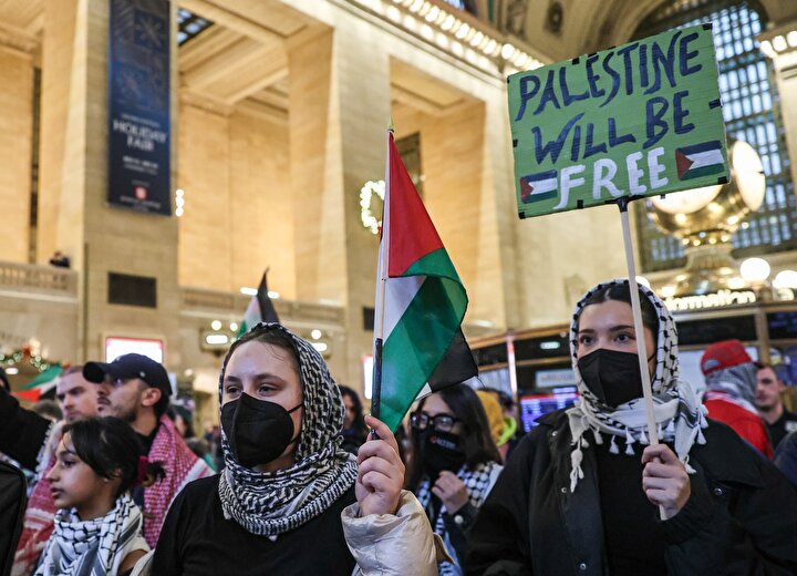 ABD'nin New York kentindeki Penn Tren İstasyonu, Port Authority Otobüs Terminali, Grand Central Terminali gibi önemli ulaşım ve toplu taşıma noktalarında Filistin'e destek gösterisi düzenlendi.