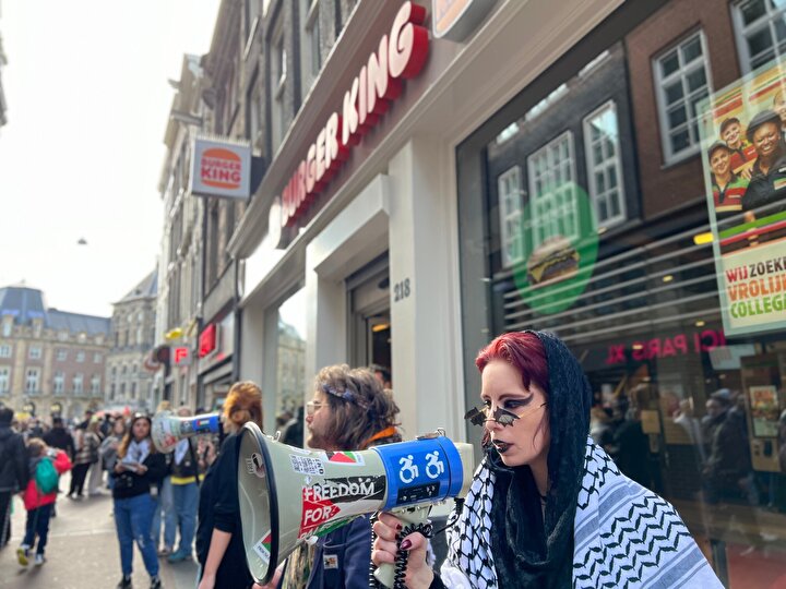 Ellerinde Filistin bayrakları ve megafonlar taşıyan grup, Burger King'in başkent Amsterdam'daki Dam Meydanı'nda yer alan şubesi önünde toplandı.