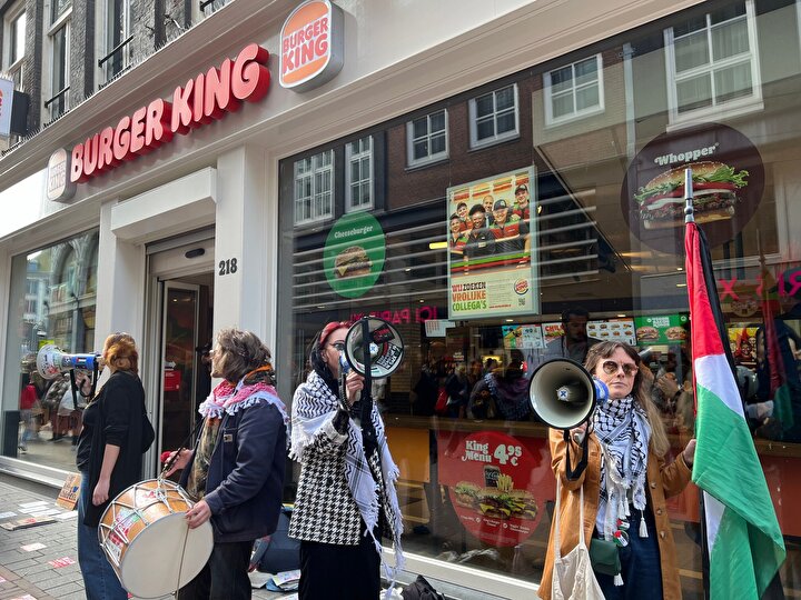 Hollanda'da, İsrail'in Gazze'ye saldırılarına tepki gösteren gruplar, hazır yemek zinciri Burger King'in farklı kentlerindeki şubeleri önünde gösteri yaptı. Ellerinde Filistin bayrakları ve megafonlar taşıyan grup, Burger King'in başkent Amsterdam'daki Dam Meydanı'nda yer alan şubesi önünde toplandı.