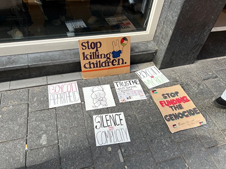 Filistin destekçileri "Çocukları öldürmeyi durdur", "Apartheid'i boykot et", "Soykırımı fonlama" ve "Sessizlik = Suç ortaklığı" yazılı dövizleri şubenin girişine bırakarak "Amsterdam soykırıma hayır diyor", "Açlığı durdur", "Özgür Filistin", "Gazze'deki soykırımı durdur", "Hollanda utan, ellerinde kan var" ve "İsrail boykot et, soykırımı boykot et" sloganları attı.