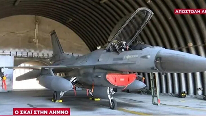 Yunanistan'ın 1923 Lozan Antlaşması gereği silahsızlandırması gereken Limni Adası'ndaki askeri üste bulunan F-16 savaş uçakları görüntülendi.