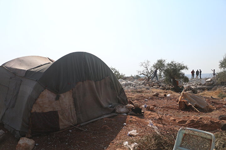 Zeytin ağaçlarının arasındaki olay yerinde, bombardımanın etkisiyle çukurların oluştuğu görülüyor.