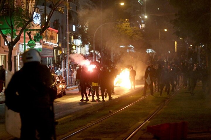 Barışçıl başlayan gösterilerde göstericilerin, ilerleyen saatlerde Nea Smyrni Emniyet Müdürlüğüne yürümek istemesi ile tansiyon yükseldi.