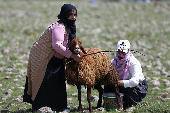 Mahalle statüsündeki köylerinin meralarında iki yıldır hayvanlarını otlatan anne ile kızı, elde ettikleri süt ürünleriyle hem üretime hem de aile ekonomisine katkıda bulunuyor.