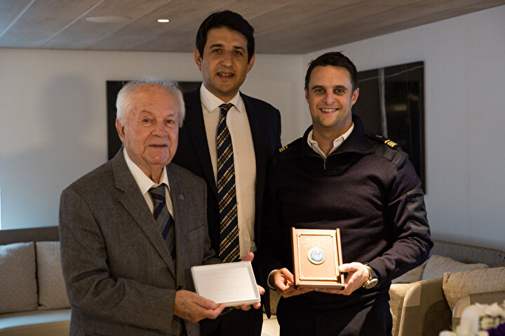 Liman Müdürü Şahin Aktan ve Zeyport şirket danışmanı Adil Göksu tarafından günün anısına geminin kaptanı Perrot Jean Edouard'a ziyaret plaketi verildi.