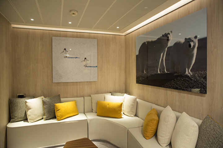 BALİNALARIN SESLERİ DUYULABİLİYOR Geminin en özel bölümlerinden biri olan 'Blue Eyes' odasını anlatan Aktan, Su altı seviyesinin altında 'karina' diye nitelendirdiğimiz bölgede yaklaşık 15 kat kalınlığında cam bölmeler oluşturulmuş. Bu bölmeler sayesinde Kuzey Buz Denizi'nde ve Antarktika kıyılarında misafirlere su altındaki canlıları görme hatta balinaların çıkardığı seslerin gemi içerisinde duyabilme imkanı var...
