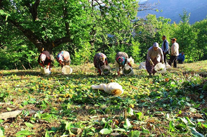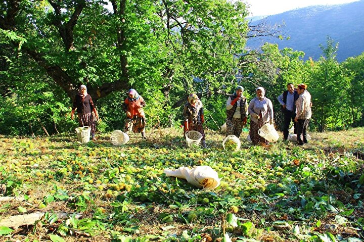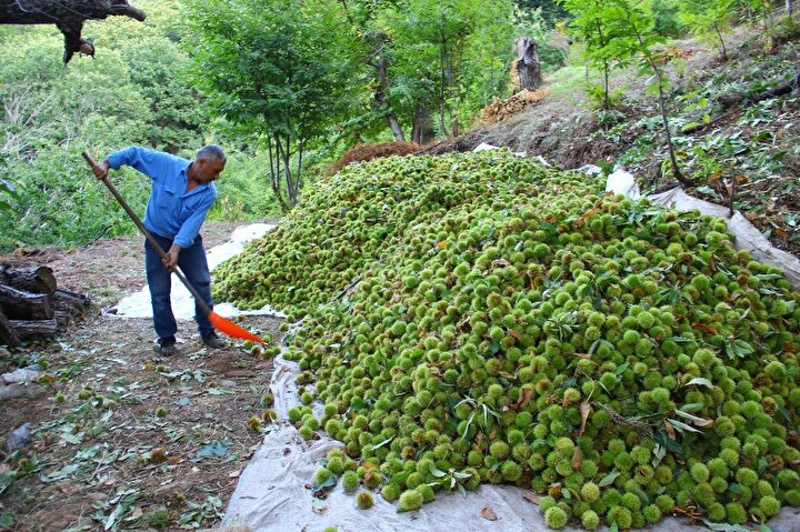 Binbir zorlukla kestane ağaçlarının dalından düşürülen kozalak içindeki yeşil kestaneler toplayıcılar tarafından diken geçirmez eldivenle toplanıp kestane kuyularında depolanıyor.