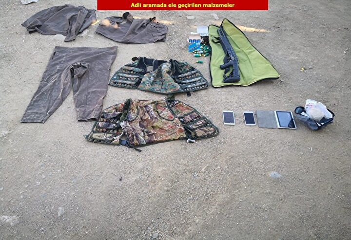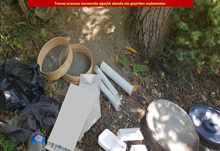 Açıklamada, aramalarda bahse konu teröristler üzerinde ve sığınak, ağaçlık, kayalık alan ile toprağa gömülü jelikan bidonlar içerisinde 3 kalaşnikof piyade tüfeği, 4 el bombası, tabanca, 11 şarjör, ruhsatsız av tüfeği, 361 fişek, çabuk nişan alma aleti, iki kilogram amonyum nitrat, telsiz, güneş paneli, 100 metre elektrik kablosu, 4 pil, iki sanayi tipi tüp, küçük dolu tüp ve çok sayıda giyim, yaşam, tıbbi malzemeleri ile örgütsel kitap ele geçirildiği ifade edilerek şunlara yer verildi: